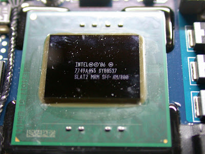>一般桌機是將散熱片透過扣具,使它能以某種程度的下壓力被固定在需要散熱的部件上,常見如 CPU 或北橋晶片。在兩者之間有散熱膏用以導熱,因為空氣是熱的不良導體。對 MBA 的 cpu 及北橋晶片來說,因為空間關係無法加裝扣具 (NB 一般是用螺絲+彈簧把散熱片鎖在cpu上) , 因此改成從四周鎖住散熱片,再加一個 L 型金屬片壓在兩塊晶片的正背面。