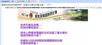 去年乃特大大的幹文言猶在耳,想不到今年某 混帳協會 SLAT 又發信 spam 了…. 如果說是因為我在Sourceforge 有帳號被發信就算了,畢竟他們搭平台還算辛苦,而且不會拿無聊的東西來騷擾我。 ICOS 2008 又是什麼東西 ? 憑什麼丟垃圾信過來 ?