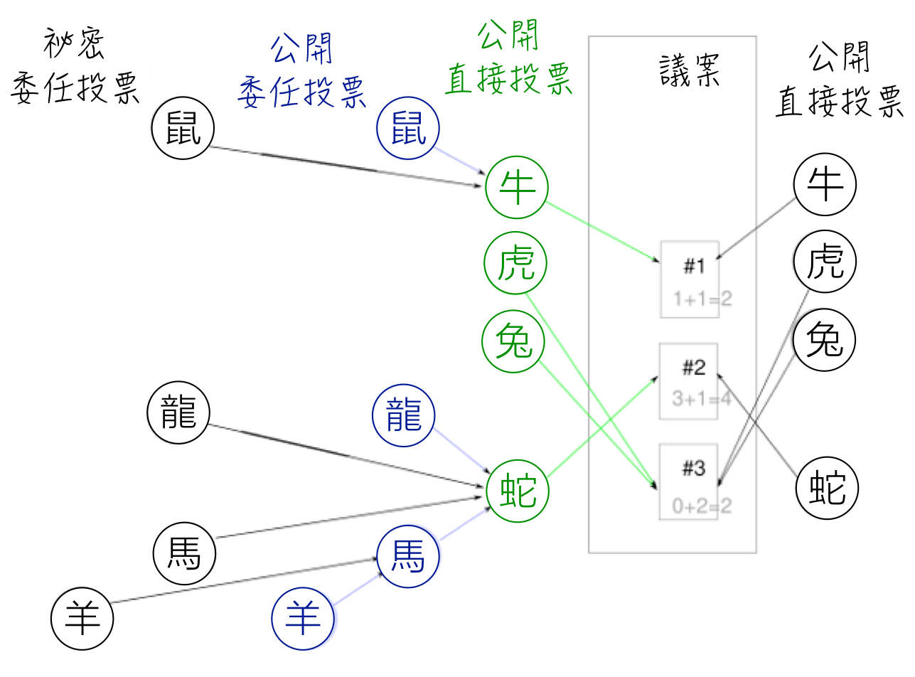 在談流動式民主 (Liquid Feedback) 的密碼學演算法前,先解說其現行 (未加密) 投票原理 — 這樣的投票方式又被稱作委任投票。